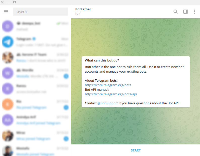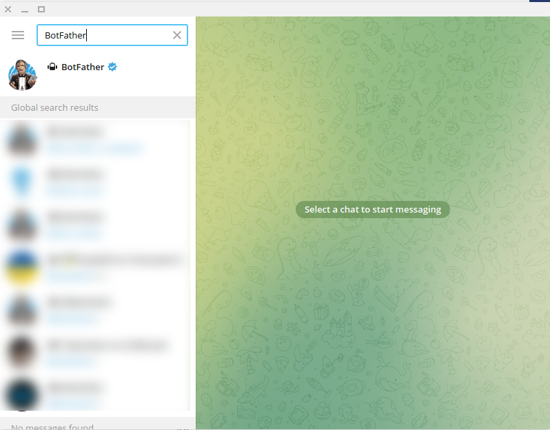 To build a Telegram bot with مُرسِل, first, open your Telegram App. Then in the search bar of the app, search with the ‘BotFather’ keyword. Then select the verified BotFather account.