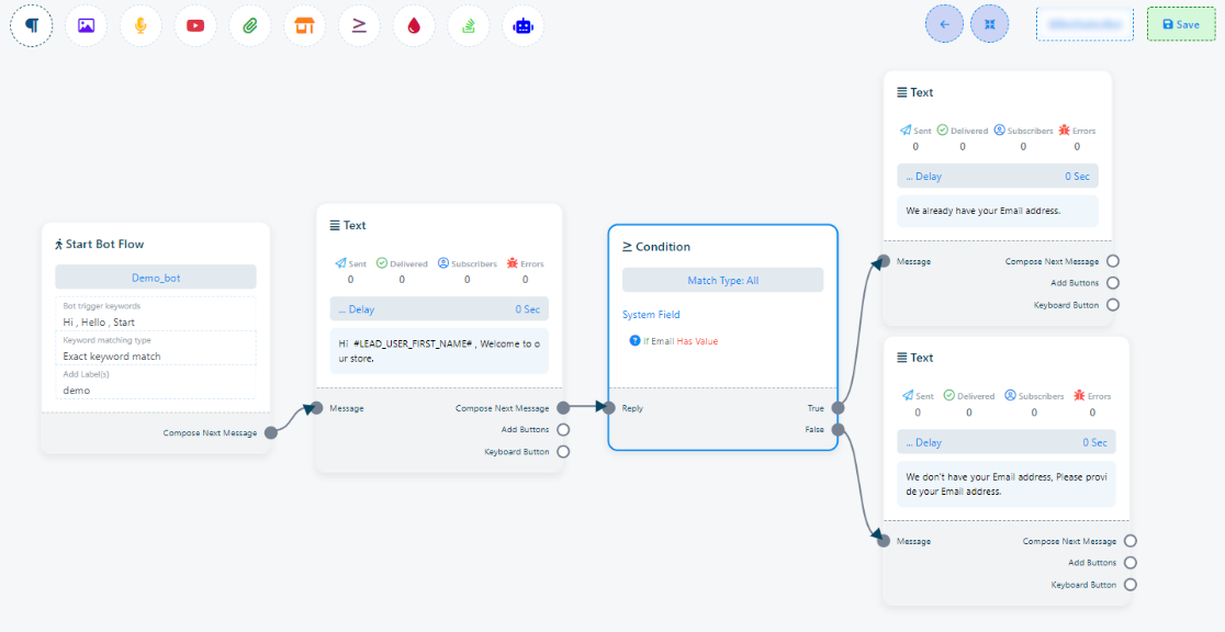 • If the condition evaluates to false, you can connect a User Input Flow message to the Text element connected to the `False` socket. This User Input Flow message will request the user to provide their email address, which can then be saved to the system or a custom field variable as needed.