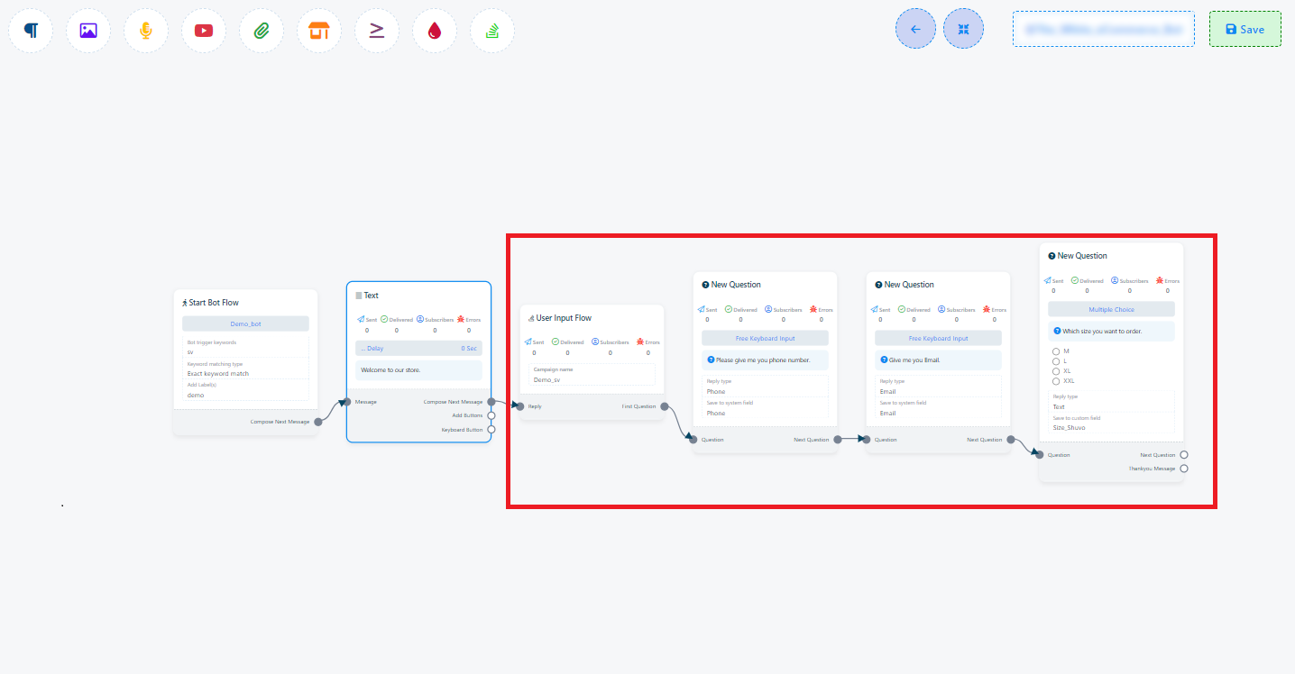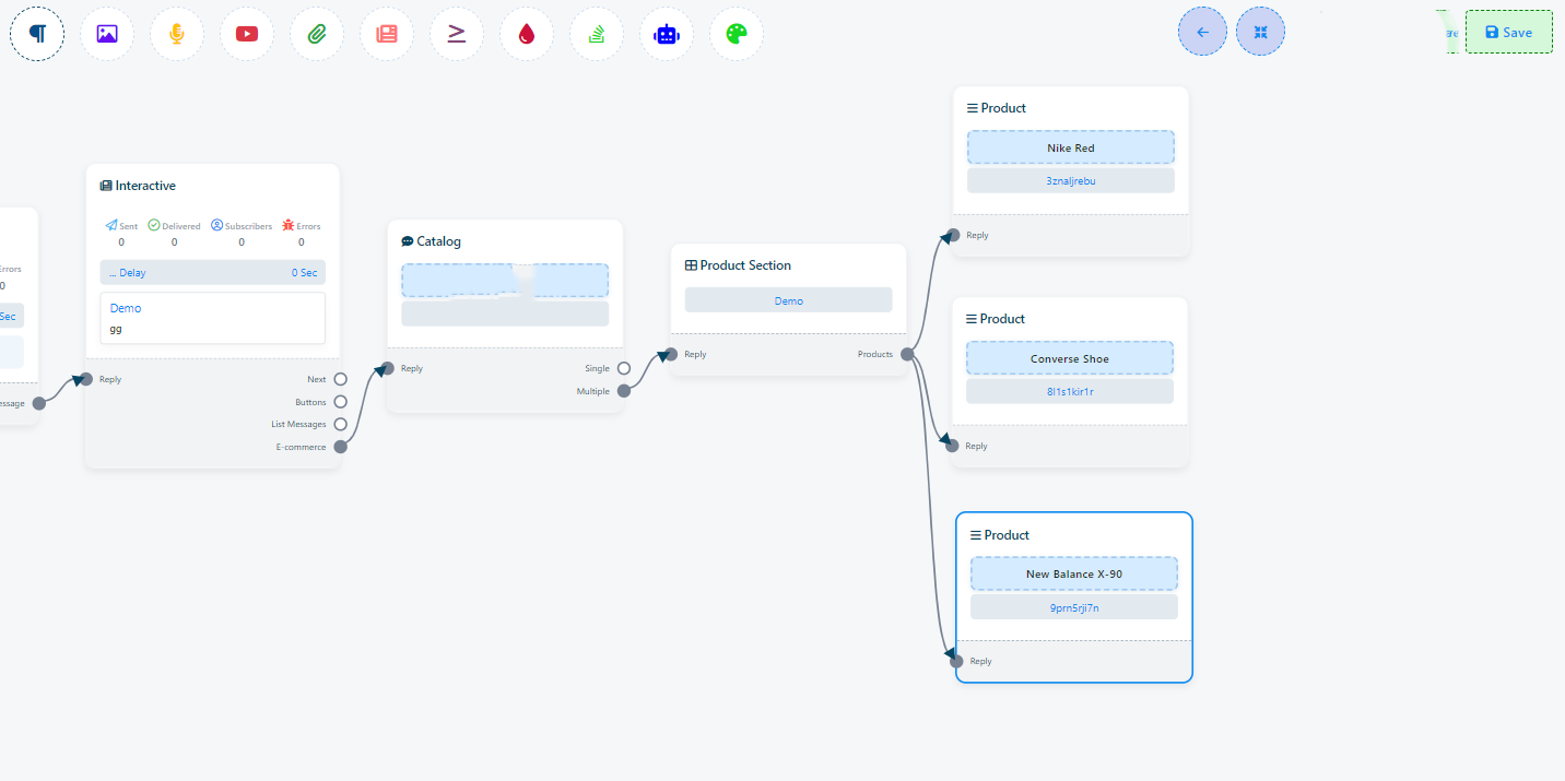 5. Once you have configured your ecommerce store within the flow builder, make sure to save your changes. Afterward, you can publish your chatbot with the ecommerce feature.
